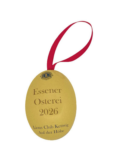 Das "Essener Osterei 2026" wird ab 28. Februar 2026 bis zum Karsamstag, 4. April 2026, in den angegebenen Verkaufsstellen in Kommission für das "Hilfswerk des Lions Club Kettwig - Auf der Höhe